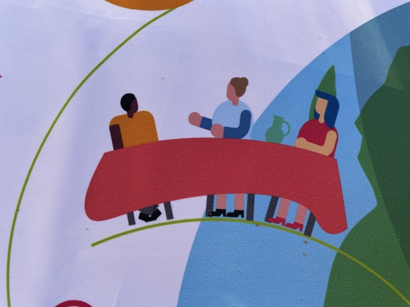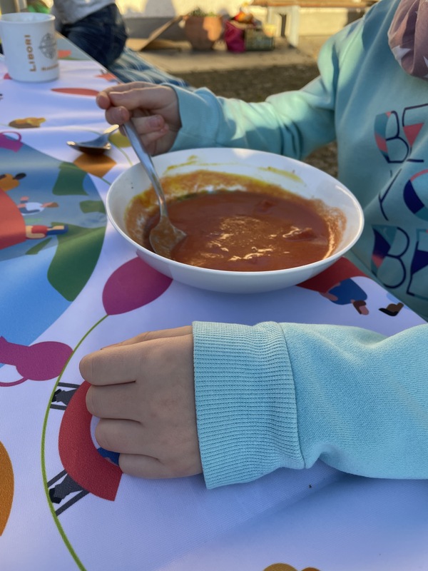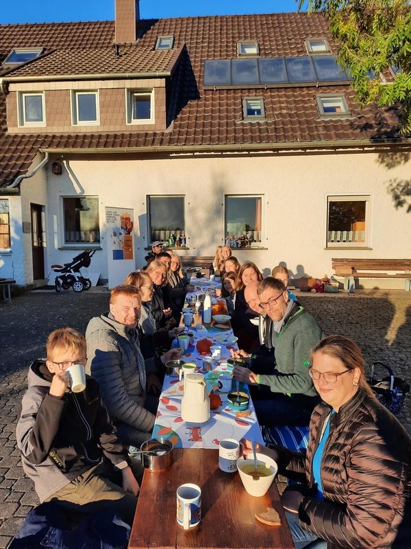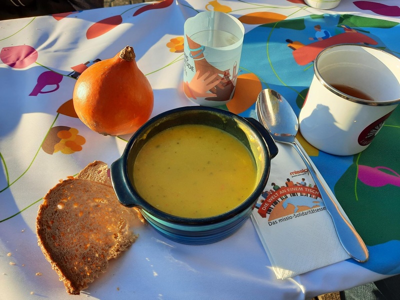 Für das gemeinschaftliche Solidaritätsessen wurde im Voraus in großen Töpfen leckere Kürbissuppe gekocht. Über dem Feuer köchelte, extra frisch, eine ebenfalls gut schmeckende Tomatensuppe. Stockbrot wurde dann am Abend sowohl von den Kleinen als auch von den Großen noch fleißig über dem Lagerfeuer gebacken.