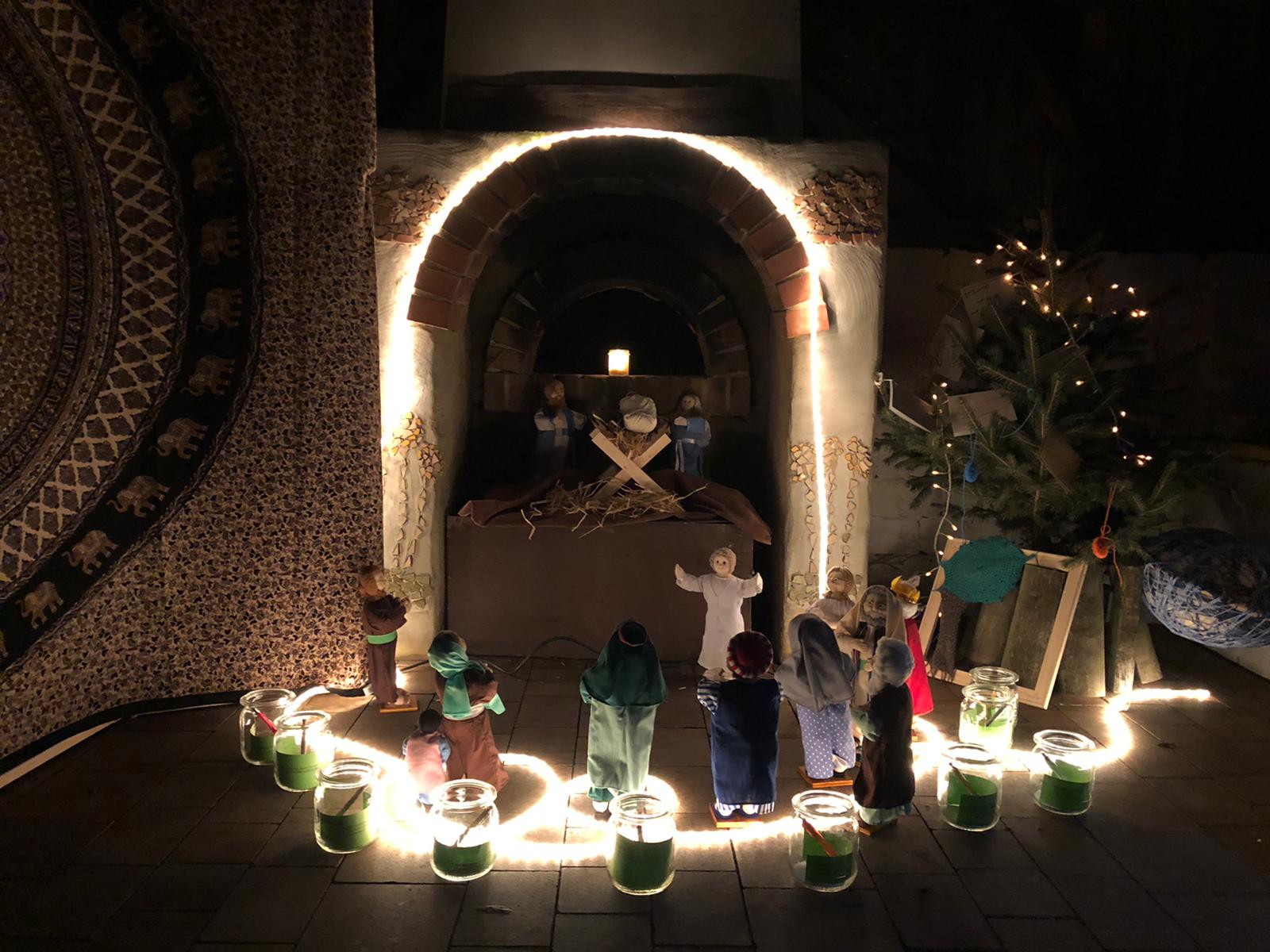 Wir stimmten uns mit einem weihnachtlichen Lied auf die Heilige Nacht ein und machten uns dann mit den Krippenfiguren gemeinsam auf den Weg zur Krippe. Auf diesem Weg stand für jede Familie ein besonderes Thema im Mittelpunkt: Mit welchem Herzenswunsch kommst du zur Krippe? Wo findest du Ruhe? Wofür bist du dankbar? Mit welcher Sorge oder Bitte kommst du zur Krippe?