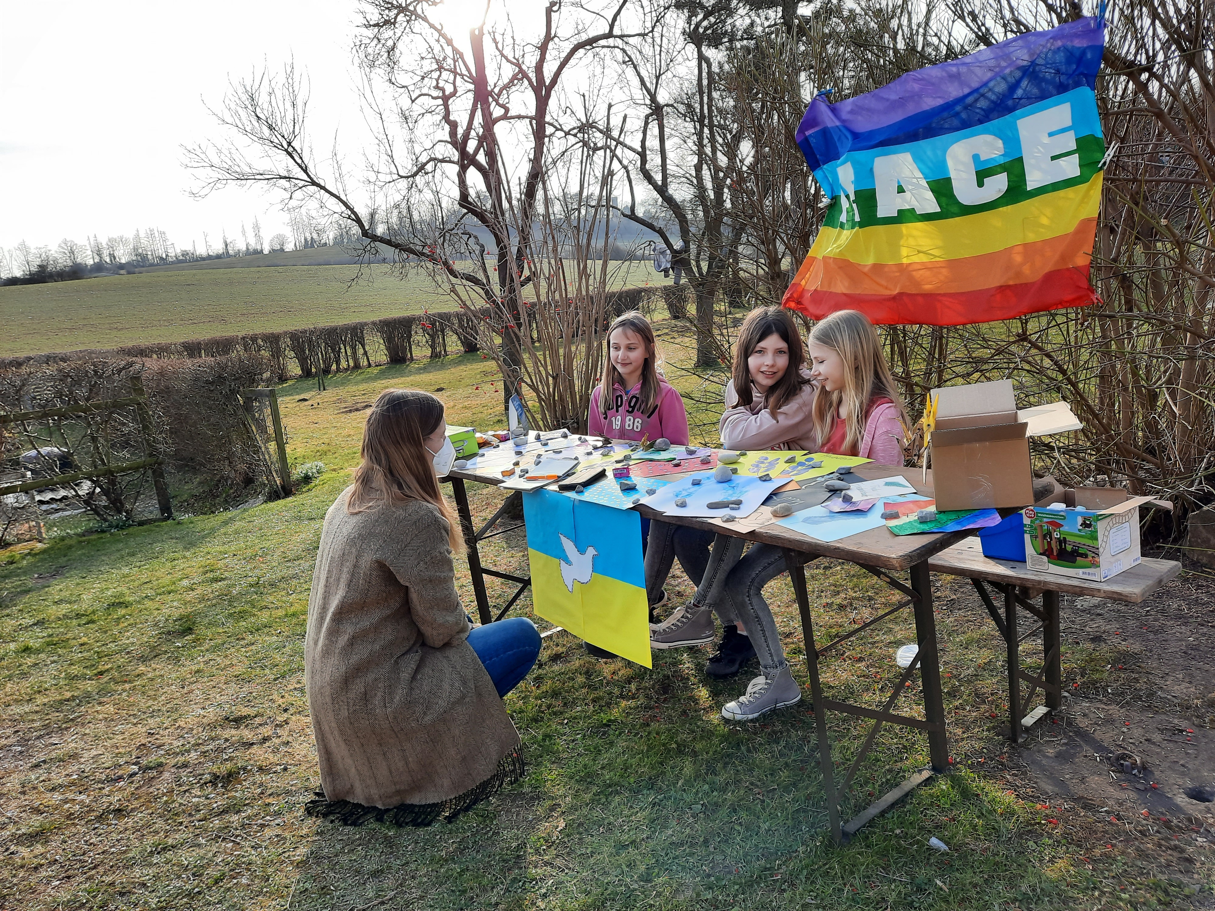 Die Kinder begrüßen die Vereinsmitglieder und Gäste am Landhaus am Heinberg mit einer Friedensbotschaft. Mit gemalten Friedenskarten und gefalteten Friedenstauben sammeln Pauline, Regina und Debora für Caritas International. Auch der Erlös aus der Umsonstbörse, wo gut erhaltene Dinge einen neuen Haushalt gefunden haben, kommt in die Spendenbox für die Ukraine.
