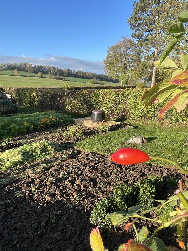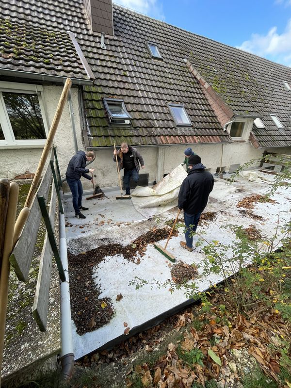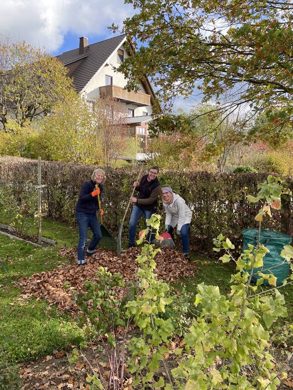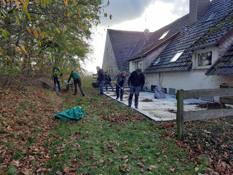 Anschließend bildeten wir verschiedene Arbeitsgruppen für Arbeiten im und ums Landhaus: Ein Küchenteam, das einen vegetarischen Herbsteintopf für das Mittagessen vorbereitete; ein Gartenteam, das Herbstlaub zusammenfegte und den Barfußpfad / das Labyrinth winterfest machte sowie ein handwerkliches Team, das sich um die Fertigstellung der Kellerabdichtung kümmerte. Das sonnige Herbstwetter motivierte alle, fleißig mitanzupacken und gemeinsam machten all diese Arbeiten sowieso viel mehr Spaß, denn „viele Hände – schnelles Ende“!
